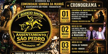O 1º Rodeio Show. A programação segue até domingo (3), reunindo montarias em touros, prova de tambor, shows musicais e uma estrutura completa para receber o público da região. TOM ALVES – ROTA MT O Assentamento São Pedro, na comunidade Sombra da Manhã, em Paranaíta, será palco de um evento inédito a partir desta sexta-feira … Continue lendo 1º Rodeio Show do Assentamento São Pedro promete movimentar Paranaíta com três dias de festa e grandes atrações
