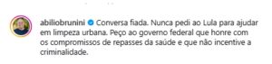 Em resposta, Abilio afirmou que suas falas foram distorcidas e reforçou que nunca solicitou recursos federais para ações como coleta de lixo, poda de árvores ou limpeza de vias públicas.