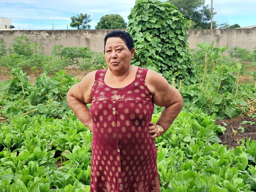 Outro ponto que reflete a mudança em sua vida é o cuidado com a saúde e a adoção de hábitos mais saudáveis. Dona Idalina é responsável por uma horta cultivada aos fundos da Unidade de Saúde do bairro Primavera III, onde produz verduras e hortaliças. Parte dessa produção, inclusive, é doada ao próprio CRAS, e outras repartições, em um gesto de solidariedade e retribuição ao apoio recebido. “Eu atuo com verdura há muito tempo e faço doação para o CRAS, para a cozinha comunitária e para a UPA”, conta.