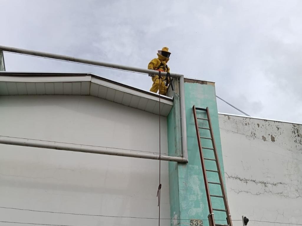 Ao chegar, os militares constataram que o enxame estava alojado no telhado da edificação, em um ponto de difícil acesso, a aproximadamente seis metros de altura. Durante a avaliação da situação, as abelhas passaram a apresentar comportamento agressivo, atacando integrantes da equipe e pessoas que transitavam nas proximidades.