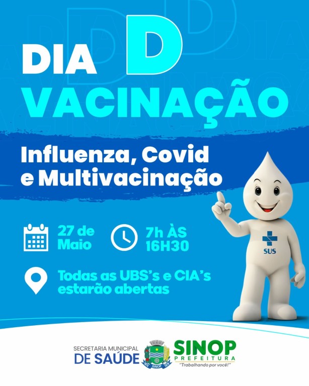 A Secretária de Saúde, por meio do departamento de imunização, irá realizar mais um dia D de vacinação. A ação será neste sábado (27) das 7h às 16h30, e todas as UBS’s e CIA’s estarão abertas.