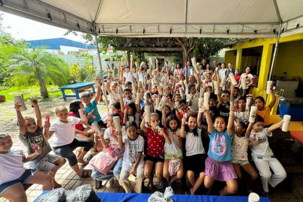 Nesta quarta-feira (5), em reconhecimento às iniciativas desenvolvidas, os estudantes receberam garrafas biodegradáveis, que substituirão o uso de copos e embalagens descartáveis. A entrega reforça o compromisso com a redução de resíduos e com a valorização do consumo consciente.