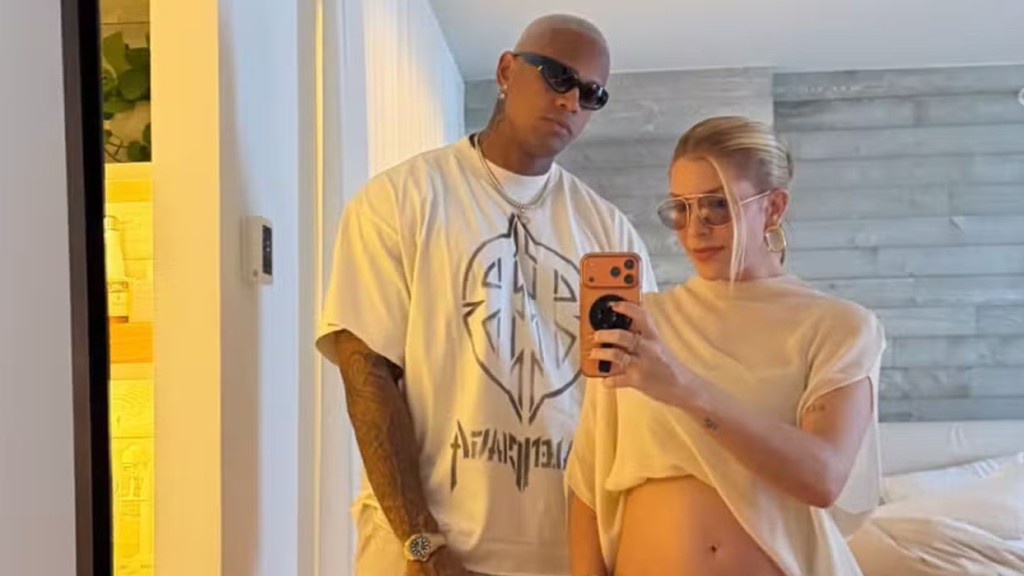 Nas redes sociais, Lore compartilhou um clique em frente ao espelho ao lado do cantor, exibindo a barriguinha da gestação. Com looks neutros e estilosos, o casal mostrou sintonia também fora dos palcos.