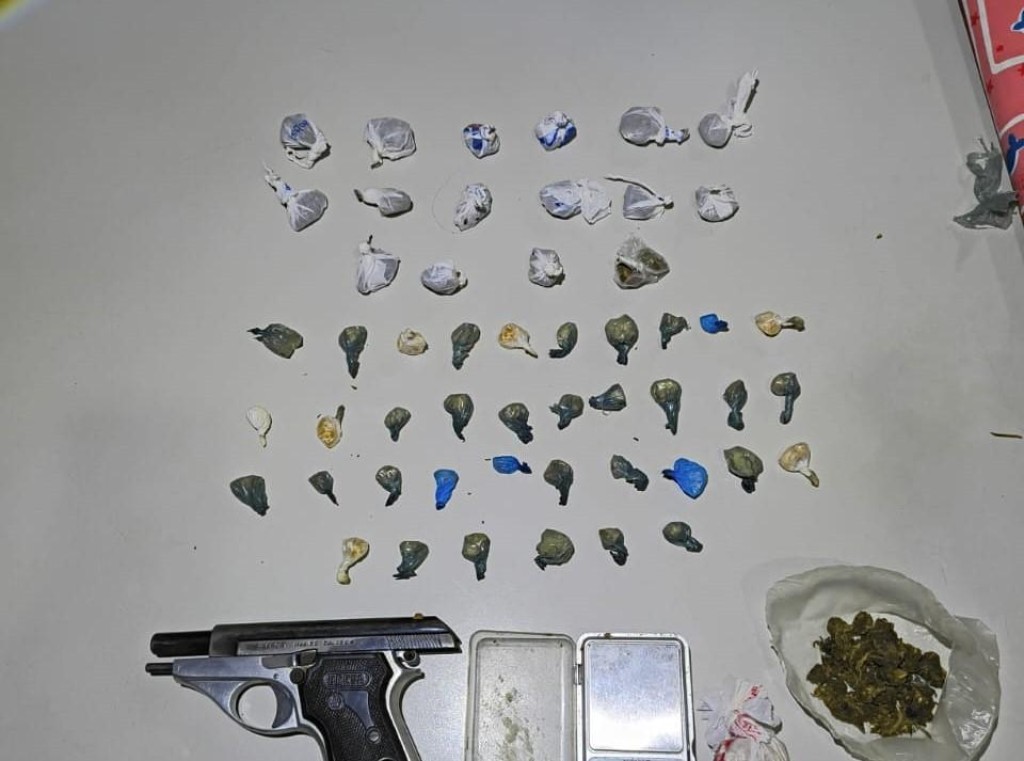 Durante revista no local, os policiais encontraram a arma de fogo utilizada no fato, munições, diversas porções de substância análoga à maconha, além de uma balança de precisão.