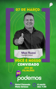 O presidente da Assembleia Legislativa de Mato Grosso, Max Russi, prepara um movimento político que promete redesenhar o cenário partidário no Estado. Neste sábado (7), em Cuiabá, ele oficializa sua filiação ao Podemos em um grande ato que também marcará a chegada de prefeitos, vereadores e lideranças políticas de diversas regiões de Mato Grosso.