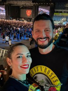 Acompanhados de familiares e amigos, o casal chegou animado à Arena Pantanal, em meio à multidão que aguardava ansiosa a entrada de Axl Rose, Slash e companhia no palco. O espetáculo começou por volta das 21h45 em uma maratona de quase três horas de hits que atravessaram gerações.