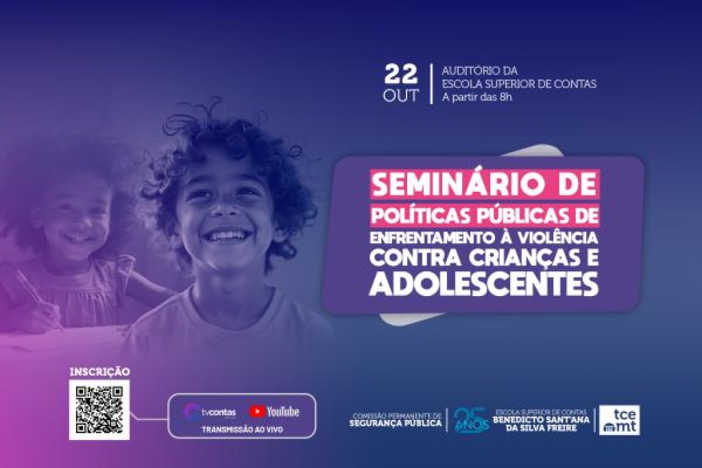 Estratégias para prevenção, acolhimento e enfrentamento da violência infantojuvenil estão no centro da programação do “Seminário de Políticas Públicas de Enfrentamento à Violência Contra Crianças e Adolescentes”, que será realizado pelo Tribunal de Contas de Mato Grosso (TCE-MT) no dia 22 de outubro. Clique aqui para se inscrever.