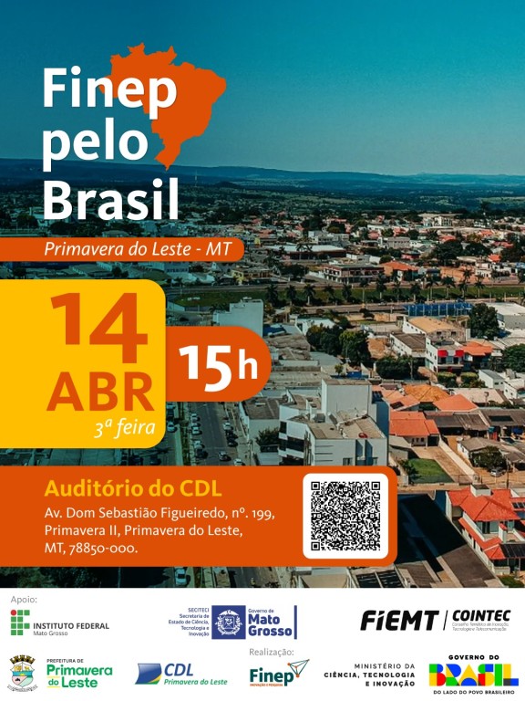 Primavera do Leste será uma das cidades contempladas pela iniciativa Finep pelo Brasil, que chega ao município no próximo dia 14 de abril, em parceria com a Prefeitura Municipal e a Secretaria de Desenvolvimento Econômico.