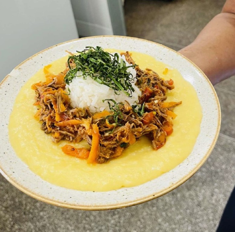 A foto ilustra um prato com porção de comida. É possível visualizar uma quantia de arroz, carne e abóbora.
