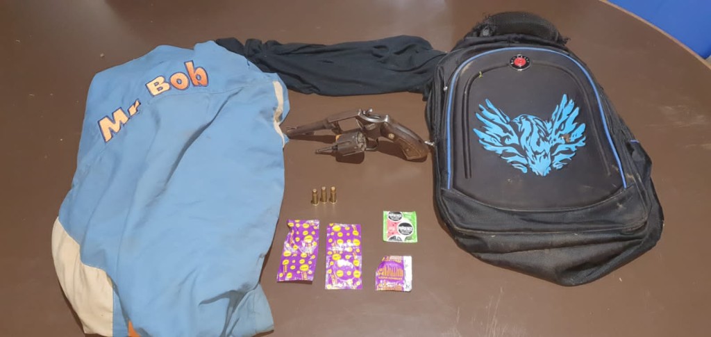 Com o suspeito foram apreendidos um revólver calibre 38, seis preservativos, uma mochila preta, uma blusa de frio e uma bandana.
